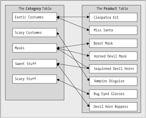 For example, your store will have a Full Costumes department, which will contain a number of categories, such as Exotic Costumes and Scary Costumes. The product catalog will contain products such as Cleopatra Kit and Vampire Disguise. If you were to build an e-commerce store based on your database, the information in these tables might be used to generate a product catalog looking something like Figure 14-1.