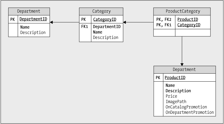 Both the Department and Category tables contain two properties: Name and Description. For both tables, Name is obligatory, and Description accepts NULLs. The Category table also contains a column named DepartmentID, which references the DepartmentID column in Department.