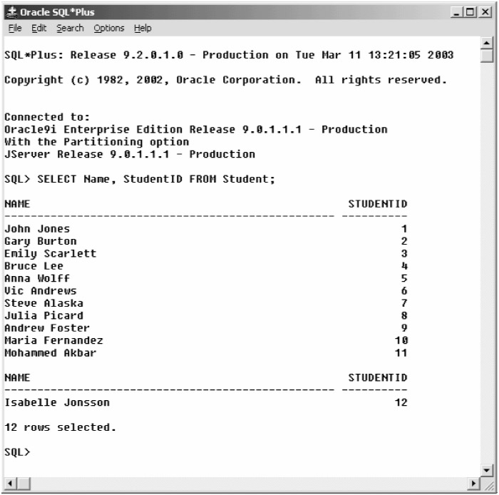 Once SQL*Plus has loaded, you can type queries directly into the editor; any results will appear immediately after the query, as shown in Figure A-5.