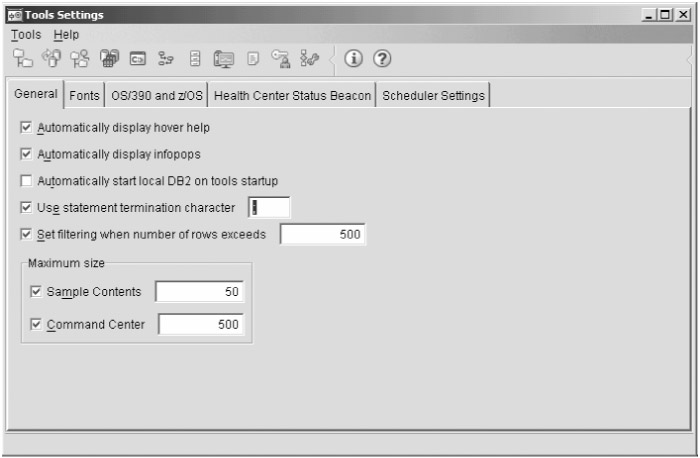 By default, Command Center will assume that any semicolons it encounters mark the end of a statement. If you want to execute multistatement queries (for example, in a BEGIN ATOMIC...END block), you need to change the default statement termination character to something else so Command Center will send the whole query, not just the part up to the first semicolon. You can do this in the Tools Ø Tools Settings dialog box, as shown in Figure A-9.