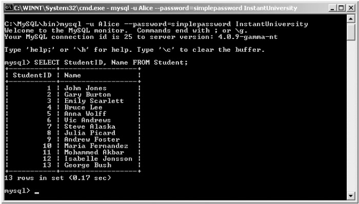 For example, to log on to the InstantUniversity database as Alice@localhost using the password simplepassword, you could use this command: