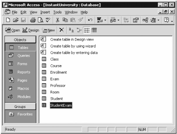 To run queries against the Access version of the database, open the database by double-clicking the InstantUniversity.mdb file in Windows. Access will display a list of the tables in the database, as shown in Figure A-11.