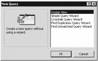 To execute SQL statements against your database, you need to create a new query. To do this, select Insert Ø Query from the main menu. Access will ask you how you want to create the query, as shown in Figure A-12.