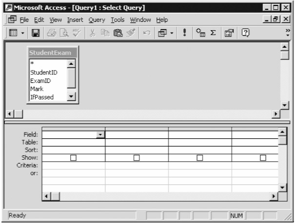 Ensure that the Design View option is highlighted, and click OK. Access will present the design view, which allows you to create queries visually rather than by writing the SQL statements by hand, as shown in Figure A-13.