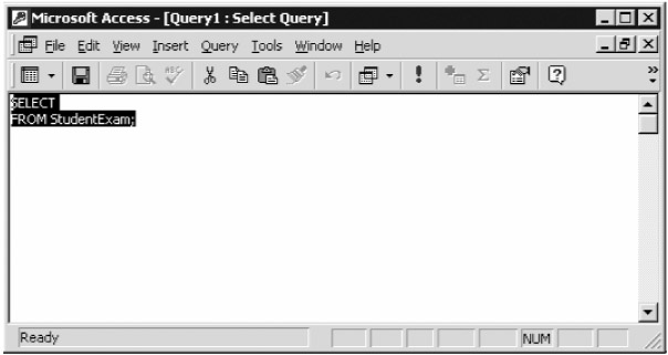 However, this is a SQL book, so you don't want to do that! Select View Ø SQL View from the main menu. Access generates the skeleton of a simple SELECT statement, based on the table highlighted when you inserted the query, as shown in Figure A-14.
