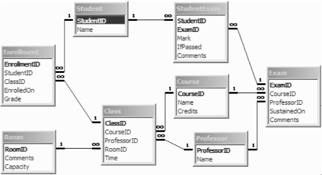The InstantUniversity sample database is designed to model a fictitious university, attended by students and professors, with courses, exams, and so on. Figure B-1 shows a visual model of the database.