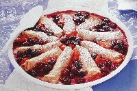Készítenünk kell egy öntetet: 2 dl tejet 1 dl tejszínnel, 1 tojás sárgájával keverjünk össze. 35 dkg feketeszedret szórjunk meg 2 dkg cukorral, 1 narancs héját reszeljünk hozzá, adjunk hozzá 4 evőkanál narancslikőrt, és a narancsot szabadítsuk meg fehér héjától, filézzük ki, keverjük az egészet a feketeszederhez.