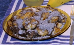 Olvasztott vajon, serpenyőben megpirítjuk a karikákat, és egy nagyobb tepsibe szedjük. Tejet forralunk, ezzel locsoljuk meg a tésztát, végül porcukros mákkal megszórjuk, mézzel vagy baracklekvárral ízesítjük.