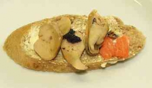 A halféléket lecsepegtetjük. A bagett kenyereket megkenjük margarinnal, majd szépen elosztjuk rajtuk a felsorolásban említett tengeri nyersanyagokat.