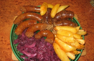 Megmossuk a hurkát, kolbászt. A megtisztított burgonyát hosszúkás cikkekre, a lila káposztát szálára vágjuk, picit megsózzuk, hogy kissé összeessen. Csepegtető ráccsal ellátott tepsibe vagy sütőtálba helyezzük a gyengéden megszurkált hurkát és a kolbászt, mellé igazítjuk az enyhén megsózott, nagyobb cikkekre vágott burgonyát, 1 dl vizet öntünk a tepsibe. 50 percre 170 fokos sütőbe helyezzük, sülés közben a lecsorgó szafttal kenegetjük a krumplikat. 30 perc után óvatosan mindent megfordítjuk, így az alja is pirosasra sül. Házi savanyúsággal, puha kenyérrel kínáljuk.