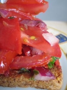 A padlizsánt, a répát és a paprikát alaposan besózzuk és borsozzuk. Magas hőmérsékleten a zöldségeket olajon puhára pirítjuk. A paradicsomot fél percre forró vízbe tesszük, levesszük a héját és felszeleteljük. A mogyoróhagymát és a fehérborecetet olívaolajon megsütjük és hozzáadjuk a paradicsomot. A kenyereket megpirítjuk és a zöldségeket a tetejére kanalazzuk.