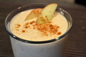 A feldarabolt almát a többi hozzávalóval együtt turmixoljuk 1 percen át. Ha kész, öntsük hosszúkás pohárba.