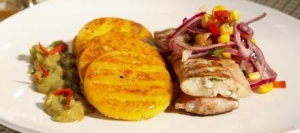 Az avokádót kimagozzuk, meghámozzuk, a húsát villával összetörjük, sózzuk, borsozzuk, meglocsoljuk citromlével, és hozzákeverjük a felaprított mentaleveleket. A halfiléket és a burgonyakorongokat izzó faszénen pár perc alatt megsütjük. A páchoz egy doboz konzerv kukoricát adunk, és 1 mokkáskanál kukoricalisztet elkeverünk benne, majd a burgonyakorongokkal, az avokádó pürével együtt köretként a hal mellé tálaljuk.