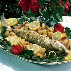 A megtisztított zöldségek közül vízben megpároljuk egy lábasban a burgonyát, a répát, és a gombát. Egy másik lábasban a patisszont és a paradicsomot. Ezután a zöldségeket olajban együtt megpirítjuk. Előmelegített tűzálló edényben olajon megsütjük a halat a forró sütőben. Kb. negyedóra sütés után a halhoz hozzáadjuk a megpirított zöldségeket, sózzuk, borsozzuk, majd fóliával letakarva még fél órát sütjük.