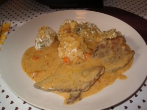 A vöröshagymát olajon megpároljuk, hozzátesszük az aprón megreszelt sárgarépát és ezzel is még együtt fonnyasztjuk, majd a felszeletelt hús következik. A húst addig pároljuk, míg elveszti a nyers színét és felöntjük egy kis vízzel, teszünk bele babérlevelet, őrölt borsot, ételízesítőt, húsleveskockát, és ha kell, sót is. (Vigyázzunk a sózással!) Ha megpuhult a hús, ráöntjük a tejfölt, amit ízesítünk mustárral, citromlével, egy kicsi cukorral, egy kanálnyi lisztet is adunk hozzá és csomómentesre keverjük, így öntjük a húsra. Pár percig még hagyjuk, míg besűrűsödik és spagettivel, vagy zsemlegombóccal tálaljuk.