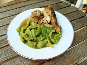 Tálaláskor az omlós csirke falatokat a saját levével is locsoljuk és tegyük mellé a spenótmártásos nokedlit.