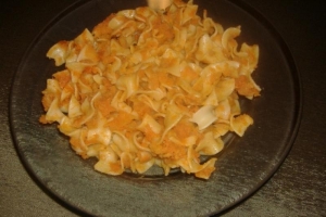 A kockára vágott krumplit és a penne tésztát fövő sós vízbe tesszük. A hagymát üvegesre sütjük, majd a felkockázott bacon szalonnát az olajon és hagymán megpirítjuk. Hozzáöntjük a 2 dl főzőtejszínt, majd elkeverjük benne a vegetát, pirospaprikát, őrölt borsot és a majoránnát. Ha a szósz besűrűsödött, elzárjuk. Egy jénai tál aljára csíkokban bacon szalonnát rakunk, és ráöntjük az előzőleg összekevert krumplit, tésztát és szószt. Reszelt sajttal megszórjuk, majd lefedés nélkül a sütőben addig sütjük, míg a sajt meg nem pirul a tetején.