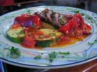 A kaliforniai paprikát a paradicsommal és az erős paprikával határozottan lepirítjuk az olívaolajon. Félretesszük, hűlni hagyjuk, a mandulát olaj nélkül megpirítjuk. A kihűlt zöldségeket a toast kenyérrel, mandulával pürésítjük. Megsütjük a sertésfilét. Zsiradékában lepirítjuk a vöröshagymát, paradicsompürét és a karikára vágott cukkínit. Fűszerezzük citromlével, sóval, borssal. Így tálaljuk, természetesen külön hozzá a zöldségkrémet.