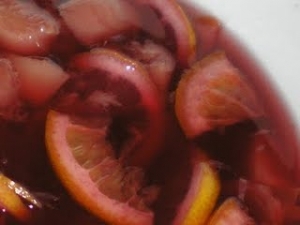 A citromot és a narancsot megmossuk és héjával együtt vékonyan felkarikázzuk. Bólés tálba tesszük és beszórjuk porcukorral és leöntjük konyakkal. Kb. félóráig állni hagyjuk. Utána hozzáadjuk a fűszereket, az apróra vágott őszibarackot, ha befőttből csináltuk, akkor a levét is, majd ráöntjük a vörösbort. Lefedve minimum két órára hűtőbe tesszük, de annál jobb, ha tovább áll. Tálalás előtt ráöntjük a jégbe hűtött pezsgőt és poharakban tálaljuk. (A hozzávalók kb. 6 személynek elegendőek.)
