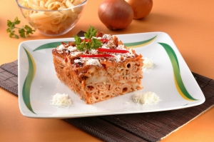 A makarónit sós, forró vízben ropogósra főzzük. Leszűrjük, lecsepegtetjük és összekeverjük a mártással. Felverjük a tojásokat és a reszelt sajttal elvegyítve a tésztába forgatjuk. Kizsírozunk egy felfújtformát. A tészta 3/4 részét kinyújtjuk a forma méretére, és kibéleljük vele. Beletöltjük a makarónit, majd befedjük a maradék kinyújtott tésztával. A tészta szélét körben lenyomkodjuk. Megkenjük a sűrített tejjel, villával többször megszurkáljuk, és 60-90 percig sütjük. Ha nagyon barnul a teteje, takarjuk le alufóliával Kakukkfűvel díszítve tálaljuk.