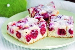 A vajat olvasszuk fel, öntsük egy mélyebb edénybe. Adjuk hozzá a porcukrot, a vaníliás cukrot, a tojásokat és a joghurtot. Tegyük az edénybe a sütőporral elkevert, átszitált lisztet is, majd kézi mixerrel alaposan dolgozzuk össze a hozzávalókat. A tészta felét öntsük egy tálba, keverjük hozzá a diót. Mindkét tésztát alaposan dolgozzuk össze. Egy 35x25 cm-es tepsit borítsunk be sütőpapírral. Kanalazzuk bele a világos, majd halmozzuk rá a barna tésztát. A meggyet csepegtessük le, magozzuk ki és rakjuk a tésztára. Előmelegített sütőben 180 °C-on süssük 20 percig a süteményt, majd kockázzuk fel, és szórjuk meg porcukorral.
