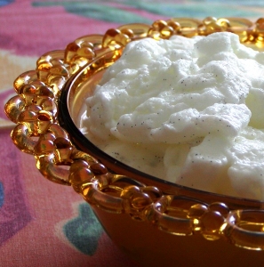 A tojások sárgáját a cukor felével és a pudingporral simára kikeverjük. A tojásfehérjét kemény habbá verjük. A tejet a cukor másik felével és a vaníliarúddal felforraljuk, majd a habot evőkanállal beleszaggatjuk a forrásban lévő tejbe. Igen lassú főzéssel megduzzasztjuk, közben 1x megforgatjuk, majd tálba szedjük. A tejet a lángról levesszük, kiszedjük belőle a vanília rudat, és vékony sugárban a tojás sárgát belekeverjük. Visszatesszük a kis lángra, állandó kevergetés mellett forrásig hevítjük, de már nem forraljuk fel. Jól lehűtve, üvegkelyhekben adagoljuk, mindegyik tetejére rakunk tojáshabgaluskát. Gyümölccsel és reszelt csokival díszítjük.