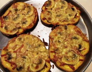 A kenyérszeleteket margarinnal kenjük meg, aztán jön rá a csíkokra vágott sonka, a nagyon vékonyra szeletelt gomba, pici só és a reszelt sajt. Nemcsak kenyérszeletekkel, hanem felezett bagettekkel, vagy zsemlével is lehet sütni.