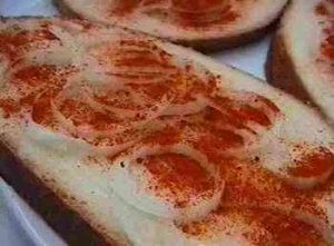 A kenyeret megkenjük a zsírral, ráfektetjük a vékonyra szeletelt és gyűrűire szedett hagymát, megsózzuk, majd megszórjuk pirospaprikával.