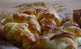 Gyorsan összeáll és 6 cipót formázunk belőle. Begyújtjuk a sütőt (200-210 fok), vékonyra nyújtjuk a cipót és nyolcadokra vágjuk. Feltekerjük kifliformákra és a sütőlapra készítjük. 20 percig még várakoztatjuk őket, addig a maradék tojásfehérjével megkenjük, szezámmaggal, sajttal, vagy köménnyel megszórjuk, és apró kockára vágunk 25 dkg margarint. Ezeket rárakosgatjuk a kiflikre és betoljuk a sütőbe.