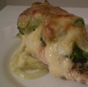 A csirkemelleket befűszerezzük, közben egy serpenyőben olajat hevítünk, amiben hirtelen kisütjük a húsokat. A brokkolit rózsákra szedjük és sós vízben megfőzzük. A tejet feltesszük forrni, közben a felolvasztott vajból a liszt segítségével rántást készítünk, majd hozzáadjuk a forró tejet. Sóval, borssal, szerecsendióval és reszelt sajttal ízesítjük. Akkor jó, ha kellően besűrűsödött. A brokkolikat lecsöpögtetjük, ráhelyezzük a húsokra úgy, hogy teljesen betakarjuk vele őket. A besamelt a zöldséges húsra öntjük, a tetejét vastagon megszűrjük reszelt sajttal és tűzálló edényben pirosra sütjük. Végül rizzsel, vagy burgonyapürével tálaljuk.