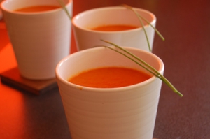 A pirospaprikákat 250 fokos sütőben 10-15 percig sütjük, majd a sütőből kivéve a paprika héját lehúzzuk, magházát eltávolítjuk. Forró olajban a hagymákat, gyömbért, fűszermagokat megpirítjuk. Hozzáadjuk a felkarikázott sárgarépát és paprikahúst, sóval, fehér borssal ízesítjük, majd puhára pároljuk. Felöntjük vízzel vagy zöldséglevessel, hozzáadjuk a paradicsompürét, cukrozzuk. Legalább 15-20 percig főzzük. Merülő mixerrel pürésítjük, szitán átpasszírozzuk. A végén tejszínnel dúsítjuk.