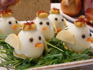 A töltött tojásokat tapasszuk a sajtkorongokra. Egy hegyes késsel kicsit vájjuk ki a szemgödröket. Ez azért kell, mert a tojás fehérjébe nem nagyon lehet belenyomni simán a borsszemeket. A lyukakba helyezzük bele a borsokat, azaz a szemeket. A csőr részhez pedig nyomjunk be szintén késsel egy vágást, majd helyezzük be a csőröket.