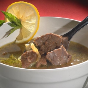 Fedő alatt 10 percig főzzük, majd beletesszük a húskockákat, és puhára főzzük. Ha szükséges, újra fűszerezzük, végül hozzáadjuk a maradék citromlevet, a mentaleveleket, a kaprot és a koriandert. Melegen tálaljuk.