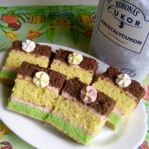 A tojások sárgáját a cukorral és a margarinnal habosra keverjük, hozzáadjuk a lisztet és a szalalkális tejet, majd a habbá vert tojásfehérjét. Három részre osztjuk. Az első rész marad sárga, a második részbe belekeverjük a kakaót, a harmadikba pedig a mandulaaromát. Egyenként sütjük, sütőpapírral bélelt tepsiben.
