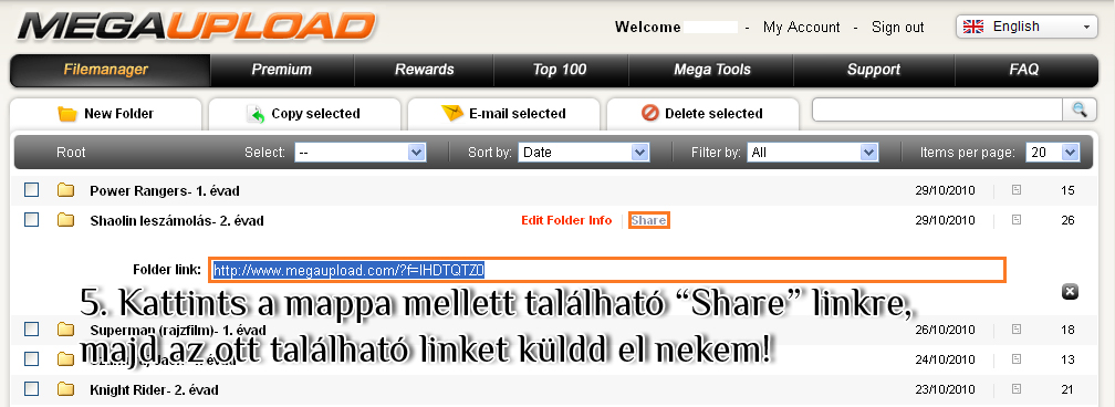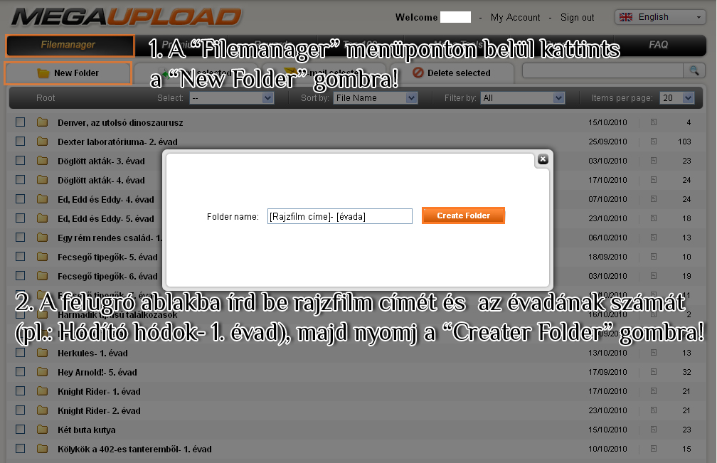 Új mappa létrehozása, fájlok kezelése a megupload oldalán
