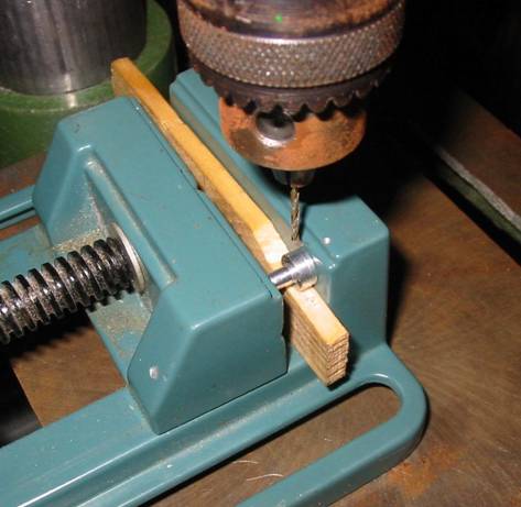 A munkadarabot most rögzítsük gépsatuba és oszlopos fúrógépen készítsük el az 1,6 mm átmérőjű, keresztirányú, menetmagfuratot. Az átlagos modellező műhelyekben ritkán szokott rendelkezésre állni 1,6 mm átmérőjű csigafúró, de esetünkben ez nem túl nagy gond, mivel alumínium alapanyagban megengedhető az 1,5 mm-es menetmagfurat is. Más, keményebb anyagnál viszont be kell szerezni a megfelelő fúrószárat, mert ez az 0,1 mm eltérés is a menetfúró törését okozhatja. A fúráshoz használjunk alumínium gépsatut, ha ez nem áll rendelkezésre akkor az acél satu pofáit fedjük be fával, hogy ne okozzon sérülést munkadarabon. A befogott munkadarab alá rakjunk fából készült éket, hogy a fúrásnál ne tudjon lenyomódni, elmozdulni.