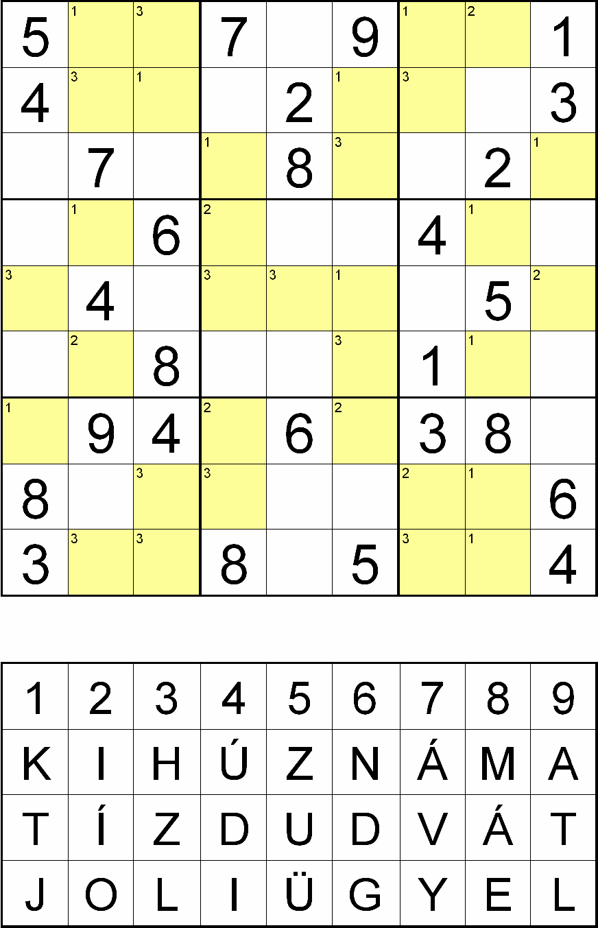 Rejtvényoldalunkon egy SZUDOKU rejtvény plusz egy vicc található. Fejtse meg a rejtvényt. Miután kitöltötte az ábrát, a sárga mezőkben a fejtés során oda kerülő számok helyére az 1-essel jelölt helyen a KIHÚZNÁM A, a 2-essel jelölt helyen a TÍZ DUDVÁT a 3-assal jelölt helyen a JOLI ÜGYEL betűiből helyettesítse be azt a betűt, amelyet a rejtvény alatti kis táblázatban az adott számhoz hozzárendeltünk! Ezek után az így behelyettesített betűket felülről lefelé, balról jobbra összeolvasva az alábbi vicc poénját kapja meg: