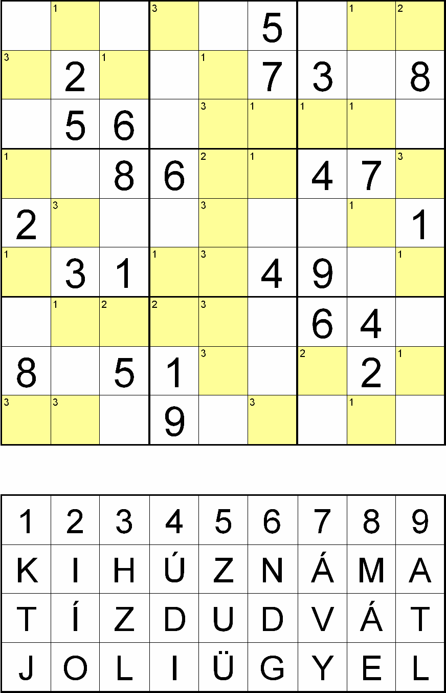 Rejtvényoldalunkon egy SZUDOKU rejtvény plusz egy vicc található. Fejtse meg a rejtvényt. Miután kitöltötte az ábrát, a sárga mezőkben a fejtés során oda kerülő számok helyére az 1-essel jelölt helyen a KIHÚZNÁM A, a 2-essel jelölt helyen a TÍZ DUDVÁT a 3-assal jelölt helyen a JOLI ÜGYEL betűiből helyettesítse be azt a betűt, amelyet a rejtvény alatti kis táblázatban az adott számhoz hozzárendeltünk! Ezek után az így behelyettesített betűket felülről lefelé, balról jobbra összeolvasva az alábbi vicc poénját kapja meg: