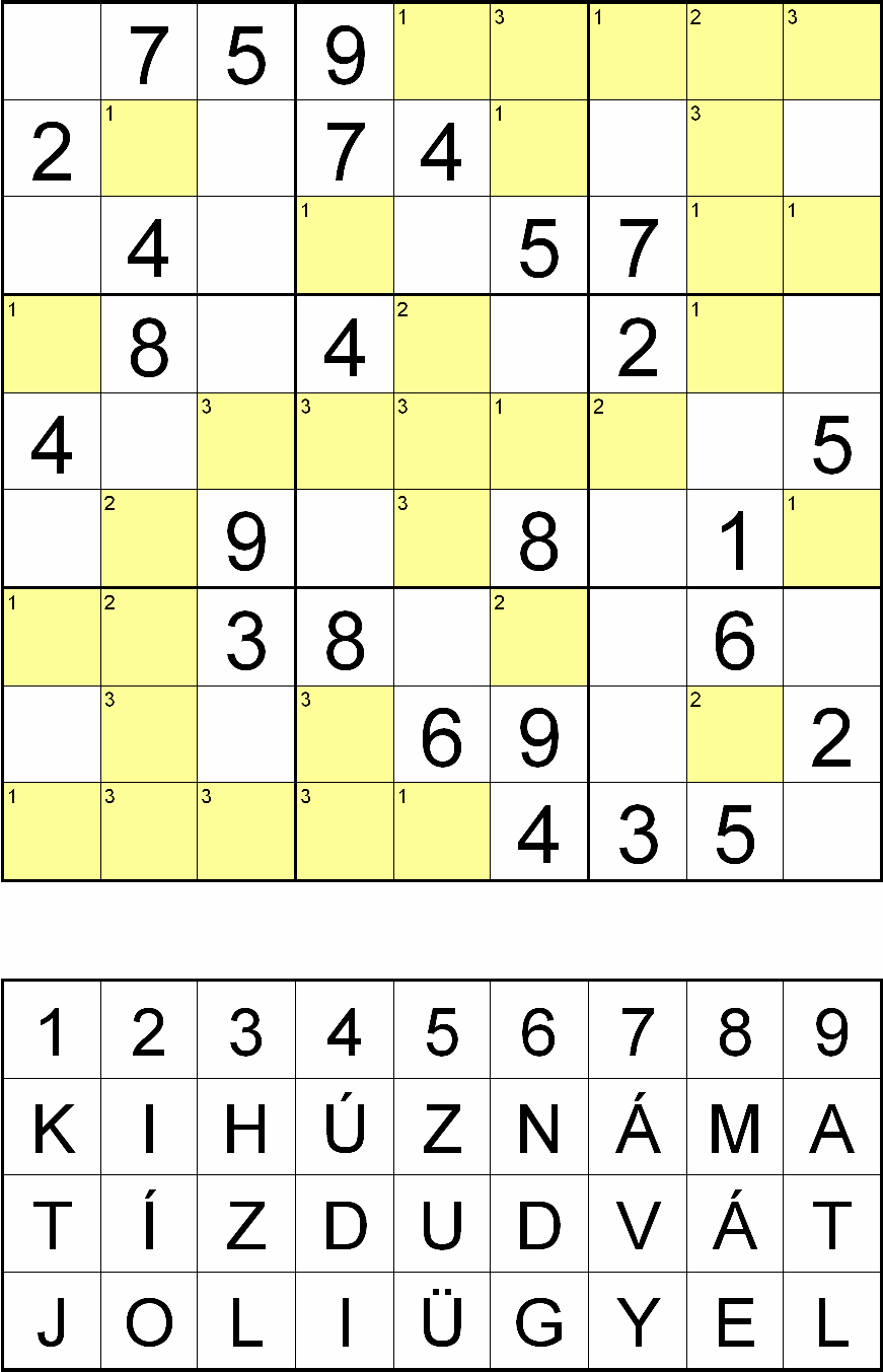 a sárga mezőkben a fejtés során oda kerülő számok helyére az 1-essel jelölt helyen a KIHÚZNÁM A, a 2-essel jelölt helyen a TÍZ DUDVÁT