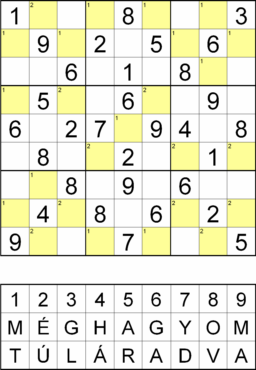 Miután megfejtette a rejtvényt, minden sárga mezőben, a fejtés során oda került szám helyére helyettesítsen be egy betűt a rejtvényábra alatti táblázatból! Ahol a kérdéses mező bal felső sarkában 1-es szám van, ott a „MÉG HAGYOM”, ahol 2-es szám van, ott pedig a „TÚLÁRADVA” betűsorból válassza a számhoz tartozó betűt!
