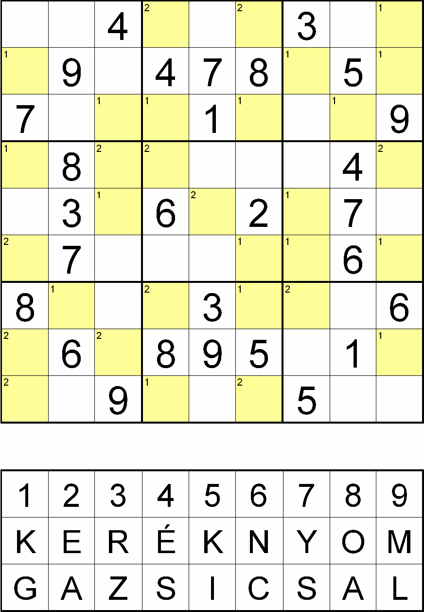 Miután megfejtette a rejtvényt, minden sárga mezőben, a fejtés során oda került szám helyére helyettesítsen be egy betűt a rejtvényábra alatti táblázatból! Ahol a kérdéses mező bal felső sarkában 1-es szám van, ott a „KERÉKNYOM”, ahol 2-es szám van, ott pedig a „GAZSI CSAL” betűsorból válassza a számhoz tartozó betűt!