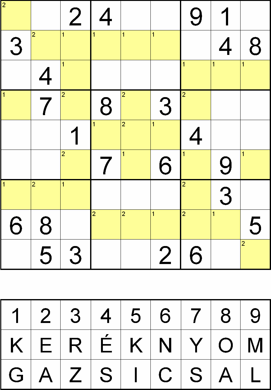 Miután megfejtette a rejtvényt, minden sárga mezőben, a fejtés során oda került szám helyére helyettesítsen be egy betűt a rejtvényábra alatti táblázatból! Ahol a kérdéses mező bal felső sarkában 1-es szám van, ott a „KERÉKNYOM”, ahol 2-es szám van, ott pedig a „GAZSI CSAL” betűsorból válassza a számhoz tartozó betűt!