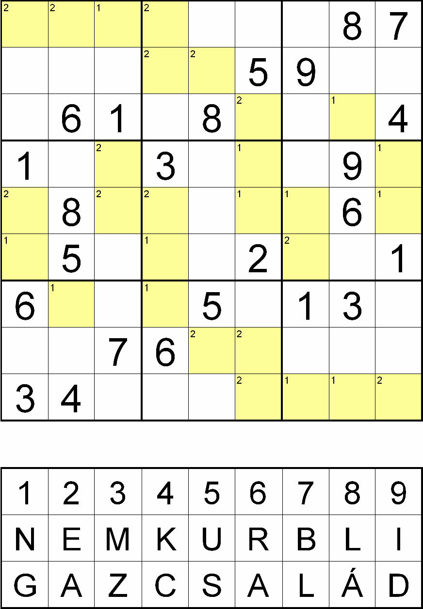 Miután megfejtette a rejtvényt, minden sárga mezőben, a fejtés során oda került szám helyére helyettesítsen be egy betűt a rejtvényábra alatti táblázatból! Ahol a kérdéses mező bal felső sarkában 1-es szám van, ott az NEM KURBLI, ahol pedig 2-es szám van, ott a GAZ CSALÁD betűsorból válassza a számhoz tartozó betűt! Ezek után az így behelyettesített betűket összeolvasva megkapja, hogy mit válaszolt az igazgatónak a takarítónő az alábbiak után: Főnök úr, én felmondok jelentette be a takarítónő a bankfiók igazgatójának. Nem tudom elviselni a bizalmatlanságukat! Mi az, hogy bizalmatlanság? Még a páncélszekrény kulcsát is mindig itt hagyom az íróasztalon...