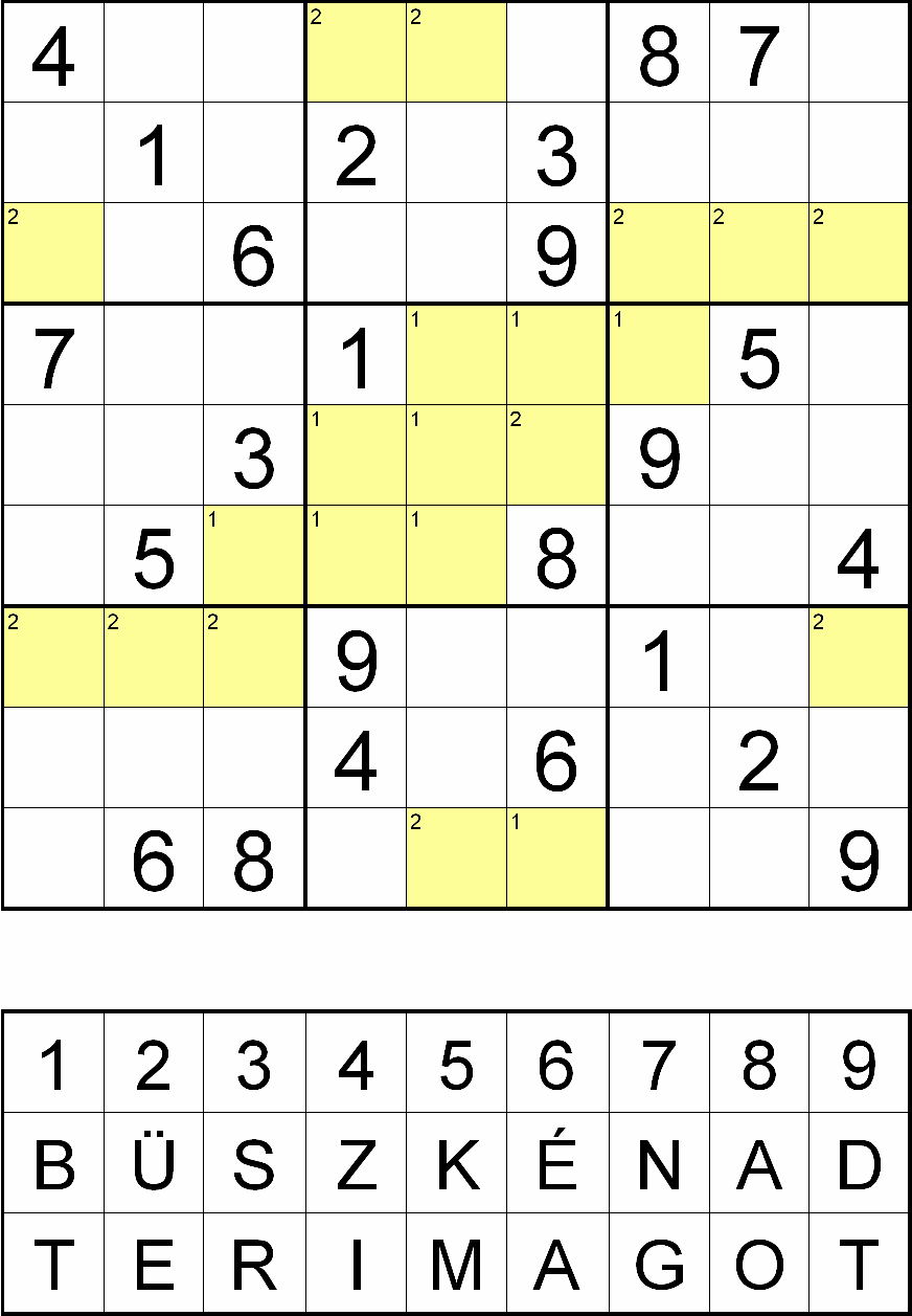 Miután megfejtette a rejtvényt, minden sárga mezőben, a fejtés során oda került szám helyére helyettesítsen be egy betűt a rejtvényábra alatti táblázatból! Ahol a kérdéses mező bal felső sarkában 1-es szám van, ott az „BÜSZKÉN AD”, ahol pedig 2-es szám van, ott a „TERI MAGOT” betűsorból válassza a számhoz tartozó betűt!