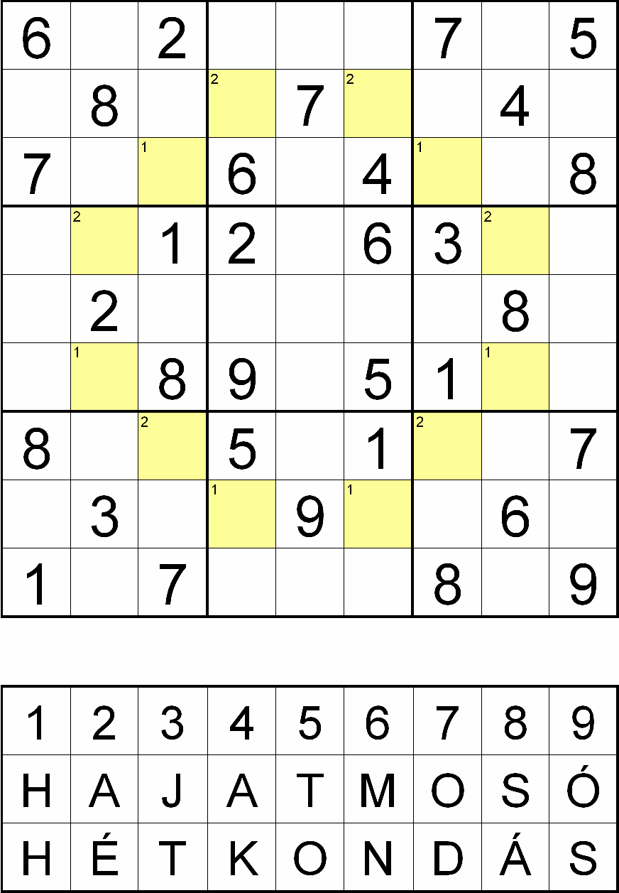 Miután megfejtette a rejtvényt, minden sárga mezőben, a fejtés során oda került szám helyére helyettesítsen be egy betűt a rejtvényábra alatti táblázatból! Ahol a kérdéses mező bal felső sarkában 1-es szám van, ott a HAJAT MOSÓ, ahol 2-es szám van, ott pedig a HÉT KONDÁS sorából válassza a számhoz tartozó betűt! Ezek után az így behelyettesített betűket összeolvasva megkapja a rejtvény szöveges megfejtését.