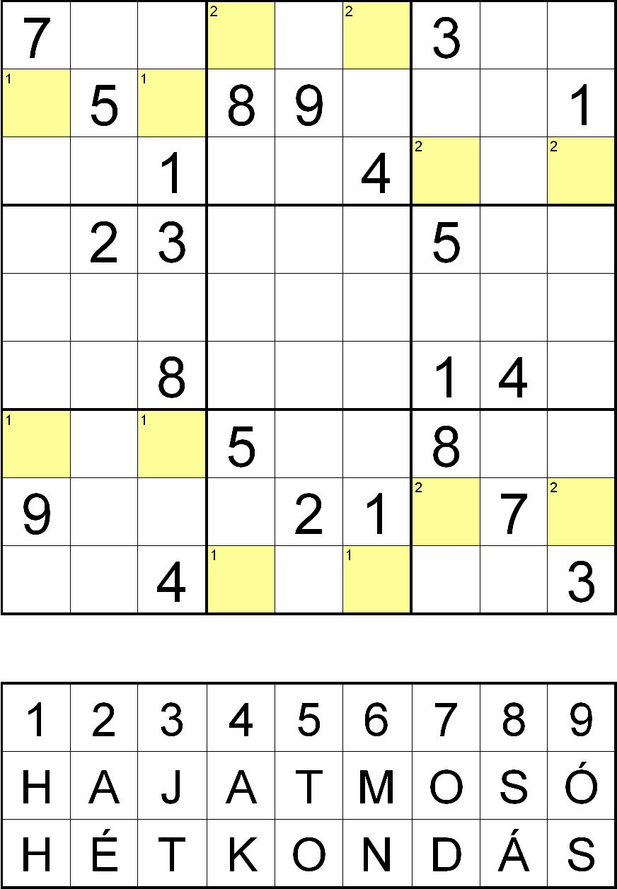 Miután megfejtette a rejtvényt, minden sárga mezőben, a fejtés során oda került szám helyére helyettesítsen be egy betűt a rejtvényábra alatti táblázatból! Ahol a kérdéses mező bal felső sarkában 1-es szám van, ott a HAJAT MOSÓ, ahol 2-es szám van, ott pedig a HÉT KONDÁS sorából válassza a számhoz tartozó betűt! Ezek után az így behelyettesített betűket összeolvasva megkapja a rejtvény szöveges megfejtését.