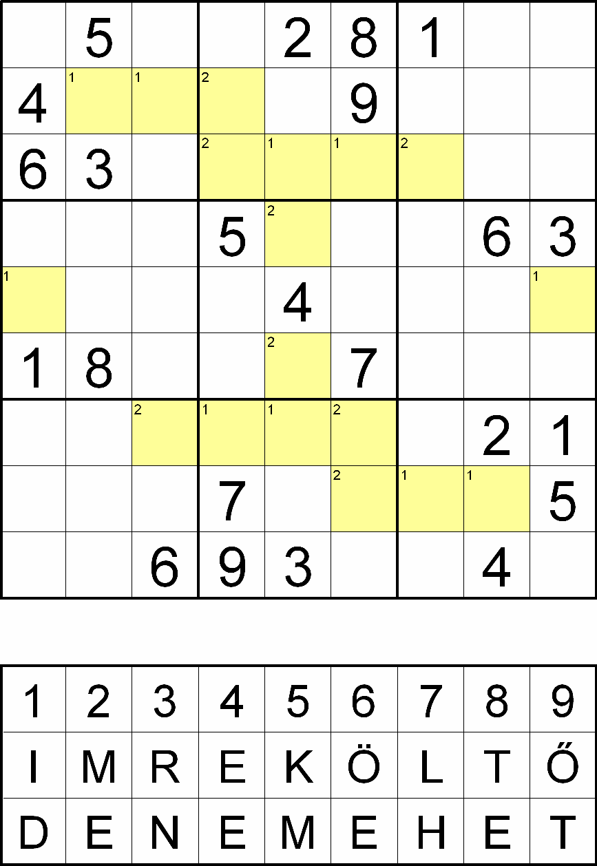 Miután megfejtette a rejtvényt, minden sárga mezőben, a fejtés során oda került szám helyére helyettesítsen be egy betűt a rejtvényábra alatti táblázatból! Ahol a kérdéses mező bal felső sarkában 1-es szám van, ott az IMRE KÖLTŐ-ből, ahol pedig 2-es szám van, ott a DE NEM EHET-ből válassza a számhoz tartozó betűt! Ezek után az így behelyettesített betűket összeolvasva megkapja a rejtvény szöveges megfejtését.