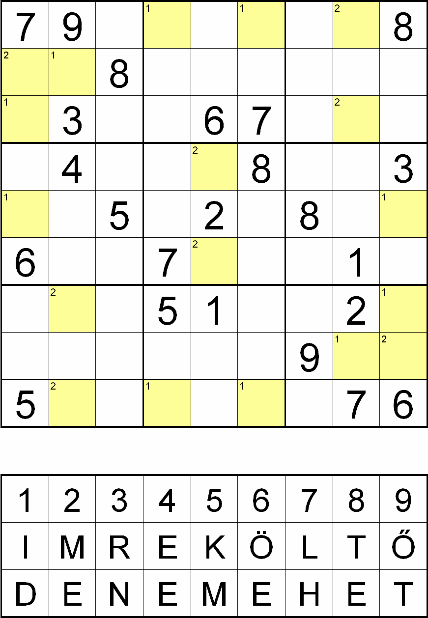 Miután megfejtette a rejtvényt, minden sárga mezőben, a fejtés során oda került szám helyére helyettesítsen be egy betűt a rejtvényábra alatti táblázatból! Ahol a kérdéses mező bal felső sarkában 1-es szám van, ott az IMRE KÖLTŐ-ből, ahol pedig 2-es szám van, ott a DE NEM EHET-ből válassza a számhoz tartozó betűt! Ezek után az így behelyettesített betűket összeolvasva megkapja a rejtvény szöveges megfejtését.