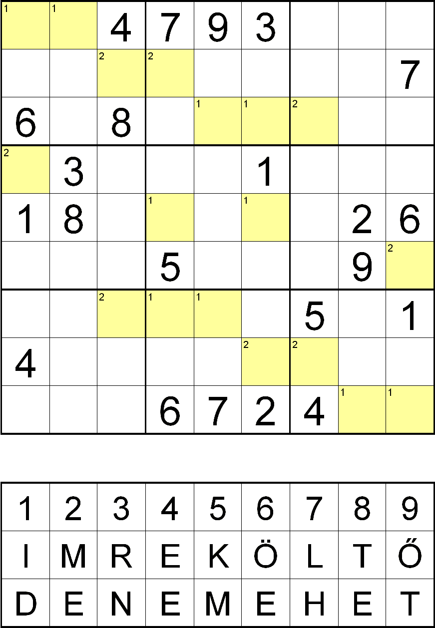 Miután megfejtette a rejtvényt, minden sárga mezőben, a fejtés során oda került szám helyére helyettesítsen be egy betűt a rejtvényábra alatti táblázatból! Ahol a kérdéses mező bal felső sarkában 1-es szám van, ott az IMRE KÖLTŐ-ből, ahol pedig 2-es szám van, ott a DE NEM EHET-ből válassza a számhoz tartozó betűt! Ezek után az így behelyettesített betűket összeolvasva megkapja a rejtvény szöveges megfejtését.