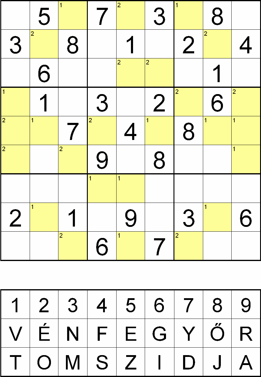 Miután megfejtette a rejtvényt, minden sárga mezőben, a fejtés során oda került szám helyére helyettesítsen be egy betűt a rejtvényábra alatti táblázatból! Ahol a kérdéses mező bal felső sarkában 1-es szám van, ott a VÉN FEGYŐR, ahol 2-es szám van, ott pedig a TOM SZIDJA sorából válassza a számhoz tartozó betűt! Ezek után az így behelyettesített betűket felülről lefelé, balról jobbra összeolvasva megkapja a rejtvény szöveges megfejtését.